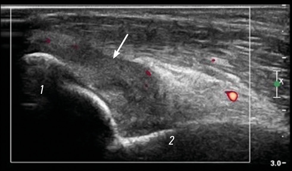 Fig. 4. Arthritis of the elbow joint, longitudinal sonogram. The joint capsule is hypertrophied mainly owing to the synovial membrane (arrow). Intense blood flow is observed in the synovium. Practically no fluid component is visible in the joint cavity. 1 — olecranon; 2 — humerus.