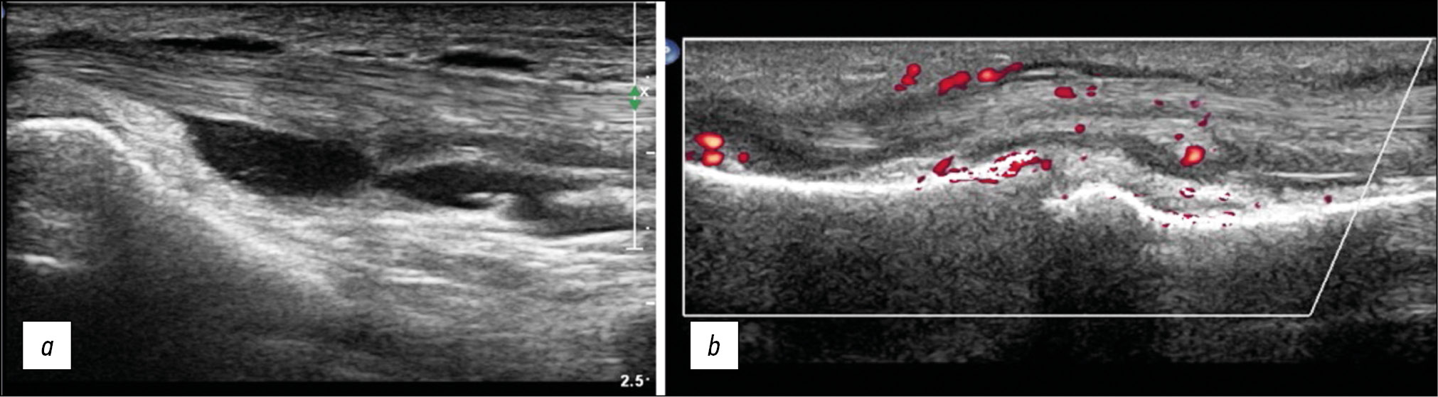Fig. 5. Longitudinal sonogram of tenosynovitis of the tendons of the long flexors of the second finger of the foot (a) and the flexor tendons of the third finger of the hand (b). Signs of tenosynovitis on ultrasound are similar in both cases and are characterized by thickening of the tendon, fluid in the synovial membrane, and hypertrophy of the synovial wall of the tendon sheath. Using the color Doppler imaging mode, blood flow in the synovium is observed .