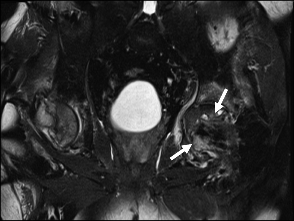 Fig. 6. Magnetic resonance imaging showing aseptic necrosis of the head of the left femur in a patient infected with coronavirus (arrows).