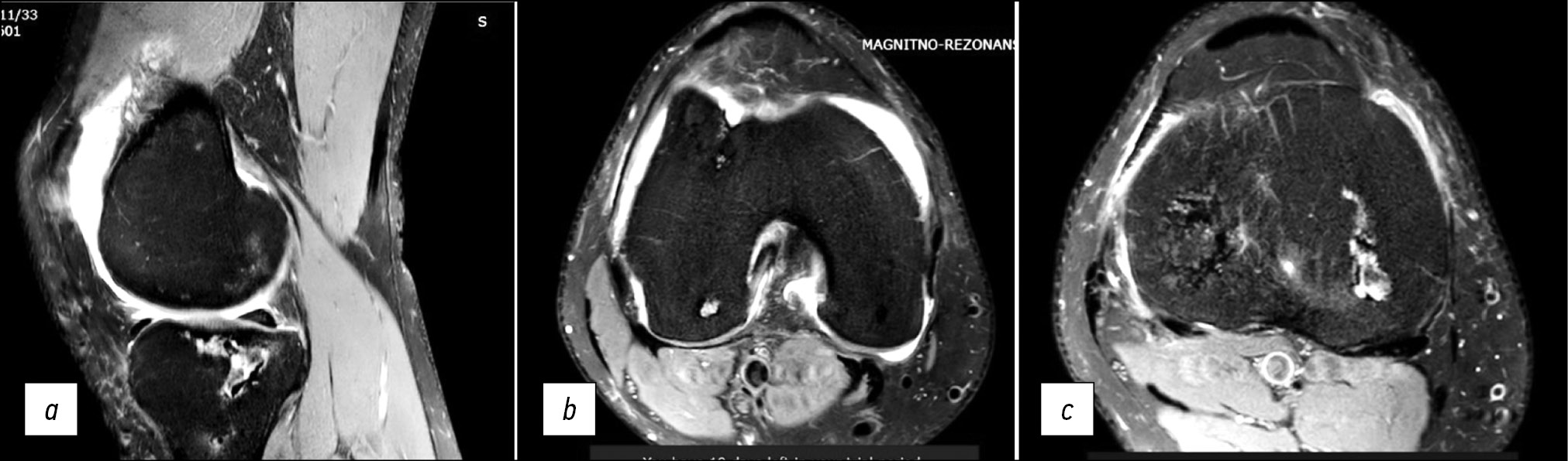 Fig. 7. Aseptic necrosis of the tibial and femoral condyles in a 22-year-old patient infected with coronavirus. Sagittal (a) and axial (b, c) magnetic resonance imaging slices.