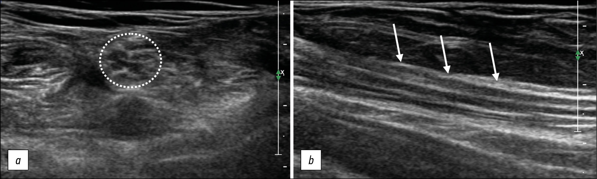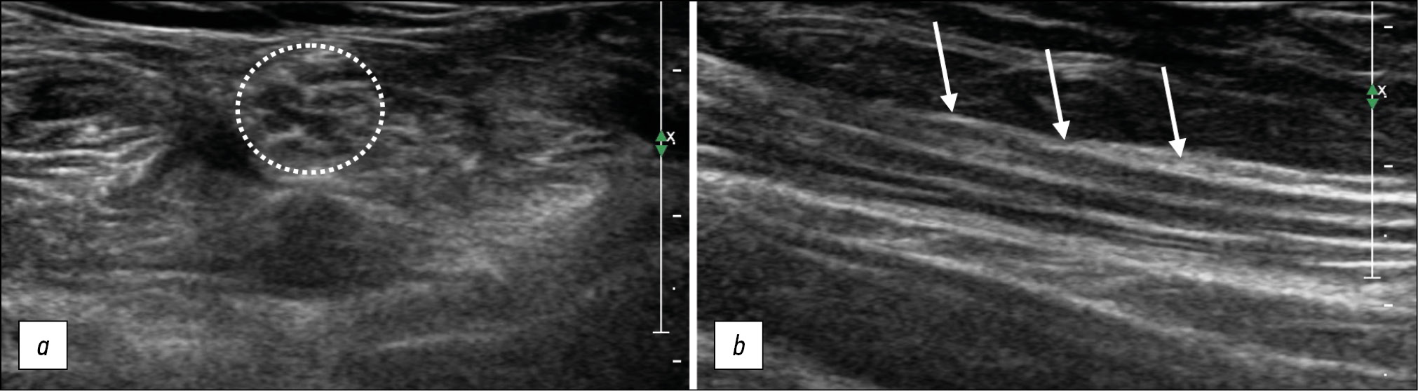 Fig. 8. Ultrasound examination of the tibial nerve in a patient with disimmune neuropathy illustrating nonspecific changes in the peripheral nerve structure. Transverse (a) and longitudinal (b) projections.