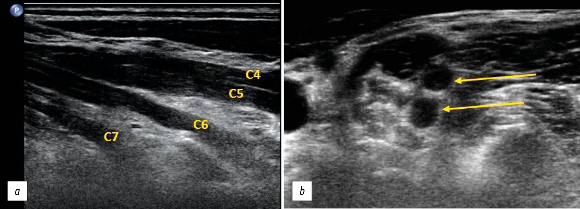 Fig. 9. Ultrasound examination of Parsonage–Turner syndrome. Thickening of the ventral branches of the C5, C6, and C7 spinal nerves and the primary upper and middle trunks of the plexus (arrows). Longitudinal (a) and transverse (b) projections of the supraclavicular part of the brachial plexus.