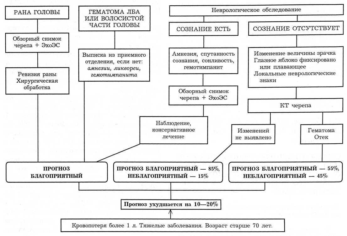 отека и дислокации головного мозга. Это осложнение имеет наибольшую значимость у пострадавших с сочетанной травмой головного мозга (1-я группа) и с сочетанной равнотяжелой травмой головного мозга и ОДА (3-я группа). Прогнозирование базируется на данных клинического, неврологического и специальных методов исследования: рентгенографии костей черепа, эхоэнцефалоскопии черепа (ЭхоЭС), компьютерной томографии (КТ) черепа. Кроме того, в схему введены факторы, ухудшающие прогноз лечения на 10—20%. К ним мы отнесли кровопотерю более 1 л, тяжелые сопутствующие заболевания и возраст пострадавшего старше 70 лет.