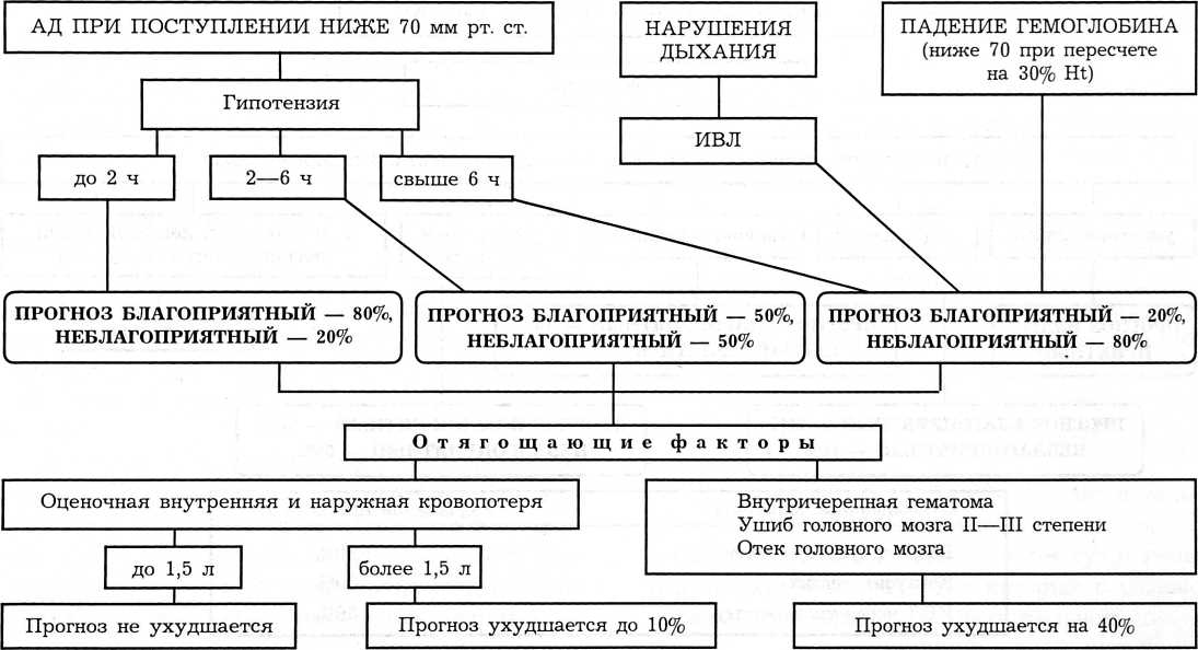Схемы 2а и 2б отражают алгоритм прогнозирования летального исхода вследствие острой кровопотери. Это осложнение наиболее значимо у пострадавших с сочетанной травмой ОДА (2-я группа). Основными прогностическими признаками являются: степень снижения артериального давления при поступлении, длительность периода гипотензии, степень падения гемоглобина, нарушение дыхания. Учитывается также оценочная внутренняя и наружная кровопотеря из мест повреждений (которую можно рассчитать лишь приблизительно по характеру повреждений костей и мягких тканей): если она меньше 1,5 л, то прогноз не ухудшается, если больше 1,5 л, прогноз ухудшается в пределах 10%. В 3-й группе внутричерепные гематомы, ушиб головного мозга II—III степени и сопровождающий их отек головного мозга ухудшают прогноз на 40%.