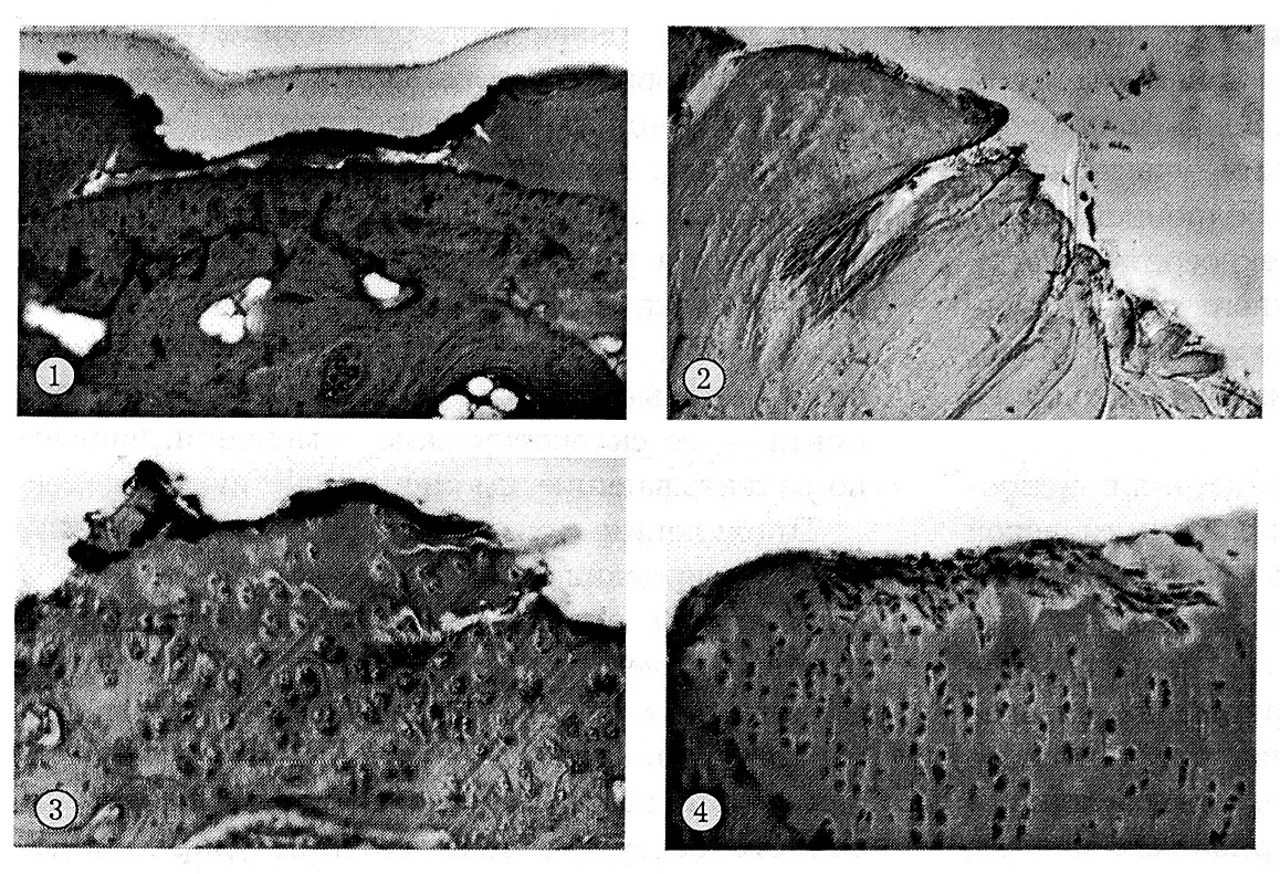 Рис. 1. Язвоподобный дефект, доходящий до субхондральной пластинки (3 сут после травмы головки бедренной кости). Ув. 35. 2. Глубокие щелевидные дефекты хряща с его некрозом (9 мес после травмы головки бедренной кости). Ув. 90. 3. Щелевидные дефекты хряща вертлужной впадины; неровный свободный край с участком поверхностного некроза (7 сут после травмы головки бедренной кости). Ув. 90. 4. Замещение поверхностного дефекта хряща головки пролиферирующими соединительнотканными клетками (3 сут после травмы большого вертела). Ув. 90.