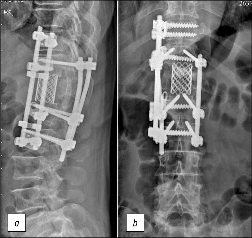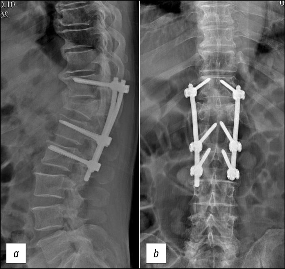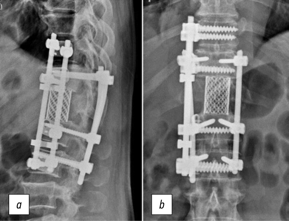 Рис. 3. Рентгенограммы позвоночника больного Е., 71 год, после операции, прямая (a) и боковая (b) проекции.