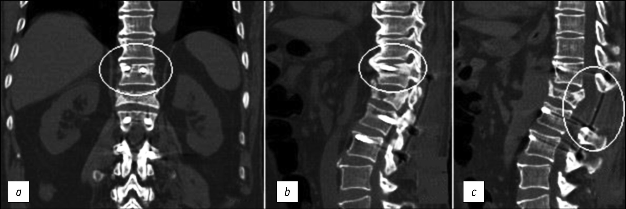 Вокруг винтов в Th11 позвонке (в теле и ножках) отмечали зону резорбции костной ткани шириной 5–9 мм (рис. 2, а). Передние концы винтов мигрировали к верхней замыкательной пластине Th11 позвонка, справа наблюдалась ее перфорация и выстояние импланта в межпозвонковый диск (рис. 2, b). Тело Th12 позвонка клиновидно деформировано, высота его снижена на 1/2. Дорзальные отделы тела позвонка пролабировали в просвет позвоночного канала до 6,5 мм, деформируя дуральный мешок на этом уровне (рис. 2, c). Полноценной консолидации перелома не наблюдалось. На уровне Th12 позвонка визуализировалась зона резекции задних структур позвоночника, которая была представлена остистым отростком, дугой, нижними и верхними суставными отростками Th12 позвонка.