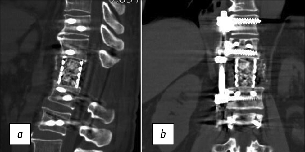 Проведены лучевые обследования (рентгенография, компьютерно-томографическое (КТ) исследование), при которых выявлен сегментарный кифоз с вершиной на уровне Th12 позвонка. Угол кифоза составил 28°. Грудопоясничный отдел позвоночника фиксирован транспедикулярной системой, инструментированы позвонки Th11, L1 и L2. Целостность элементов конструкции не нарушена (рис. 1).