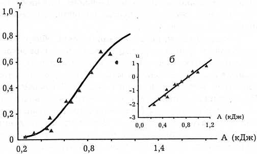 Зависимость степени гемолиза (у) от величины работы расширения газа в ударной трубе (а) и ее линеаризация с помощью функции теоретического нормального распределения (б).