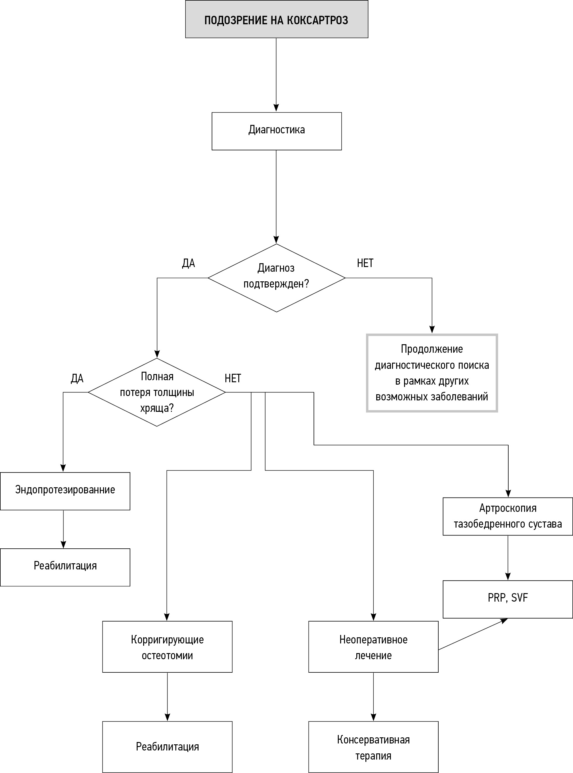 Рекомендовано выявление и учет заболеваний со схожей клинической картиной коксартроза для проведения дифференциальной диагностики КА [1, 15, 86].