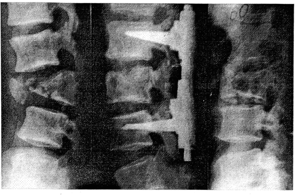 В 536 случаях использовали передний доступ по Кловарду с передней декомпрессией и спондилодезом фигурными ауто- либо аллотрансплантатами по методике Симонса. Наши наблюдения показали, что наиболее полноценный спондилодез формируется при использовании аутотрансплантатов из крыла подвздошной кости. У 9 пациентов были применены имплантаты из корундовой керамики, однако, как выявила КТ, не во всех случаях происходило полноценное сращение, тогда как опасность смещения керамического протеза иногда имелась даже в отдаленном периоде после вмешательства.