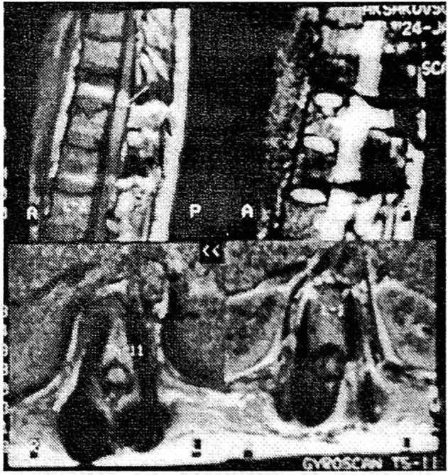 Для уточнения степени и характера повреждения спинного мозга и сдавления его костными фрагментами, дисками и другими мягкотканными структурами мы широко используем, кроме клинико-рентгенологических методов исследования и миелографии с омнипаком, компьютерную рентгеновскую томографию (КТ), компьютерно-томографическую миелографию и магнитно-резонансную томографию (МРТ) без или с магневистом, что позволяет четко определить состояние спинного мозга и позвоночного канала.