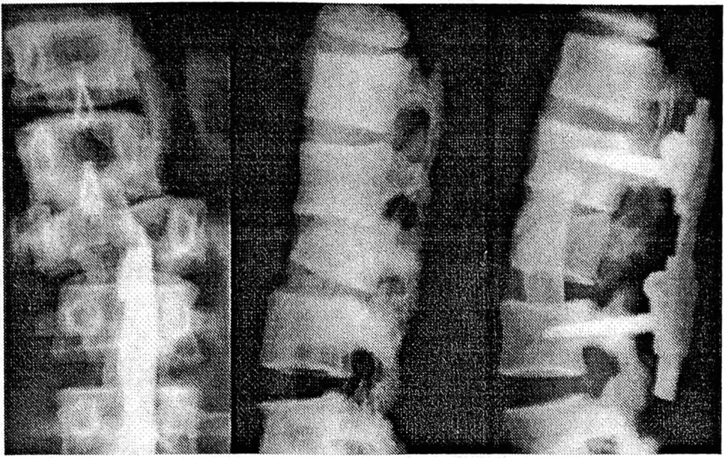 Рис. 3. Рентгенограммы позвоночника больного с передним переломовывихом L2—3 позвонков до операции, после операции и через 2 года после удаления фиксатора «Медбиотех».
