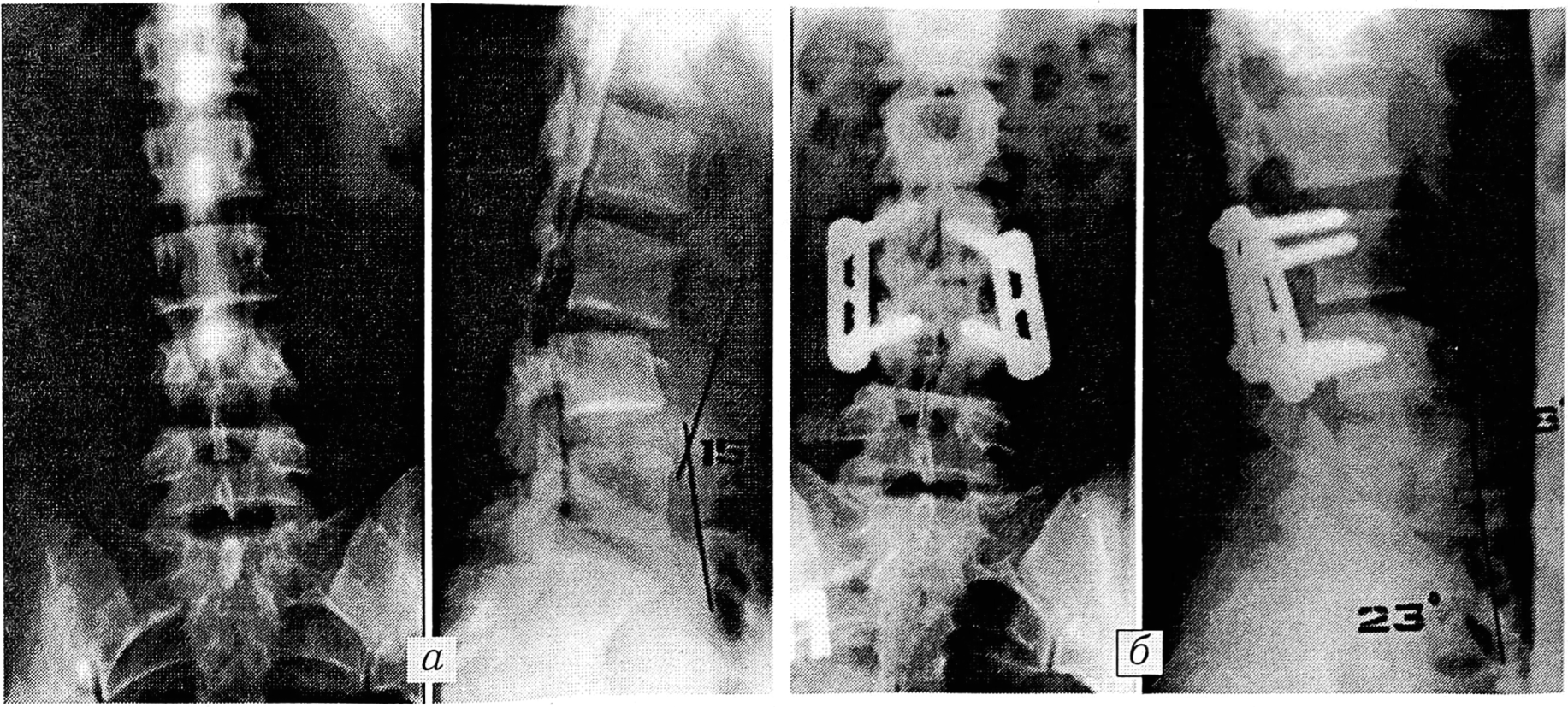 Травма получена в результате падения с параплана с высоты 5 м. Перелом L1 позвонка, сопровождающийся сдавлением дурального мешка до 1/3 диаметра (а). Неврологически: оживление сухожильных рефлексов, выражены симптомы натяжения. Операция (б): фенестрация диска Т12—L1 с удалением его, фиксация Т12 —L2 позвонков системой Steffee, межтеловой спондилодез Т12—L1 аутотрансплантатом из резецированного XII ребра.