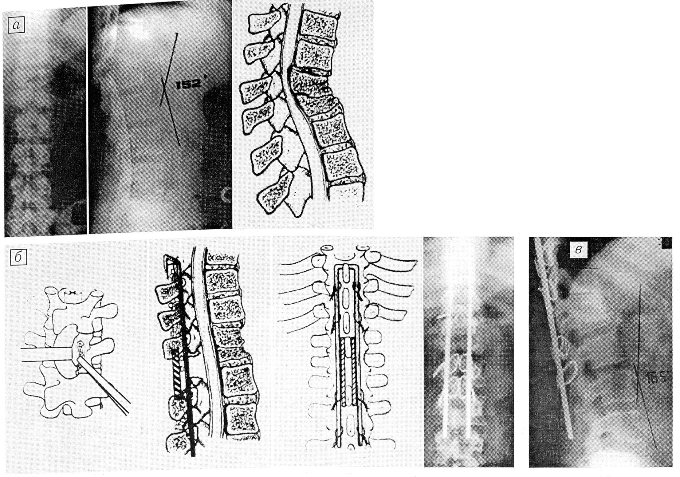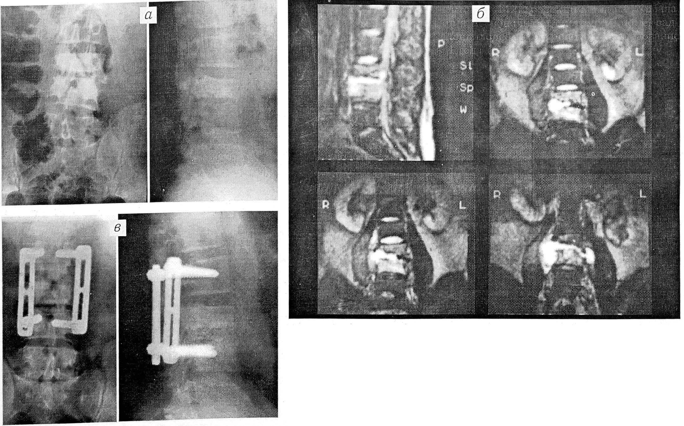 С туберкулезным поражением L3 позвонка. На рентгенограммах до операции (а) видна деструкция тела L3 позвонка, на MP-томограмме (б), кроме того, определяется гнойный натечник. Операция (в): секвестрнекрэктомия L3 позвонка, санация гнойника, фиксация позвоночника системой Steffee, межтеловой спондилодез.