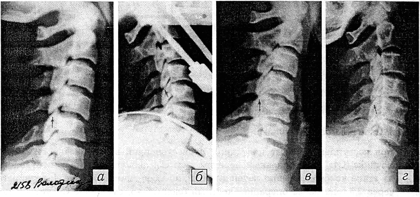 Произведена закрытая репозиция нашим устройством с узлом дозированного вправления (рис. 2, б). Штанги головодержателя закреплены в достигнутом положении, узел дозированного вправления демонтирован. Через 5 нед демонтировано все устройство. В дальнейшем иммобилизация осуществлялась торакокраниальной гипсовой повязкой (до 4 мес с момента травмы). На контрольных функциональных рентгенограммах патологической подвижности двигательного сегмента С4—5 не выявлено. Спустя 3 мес больной приступил к прежней работе (шофер). Осмотрен через 8 лет: жалоб не предъявляет, признаков нестабильности нет (рис. 2, в, г).