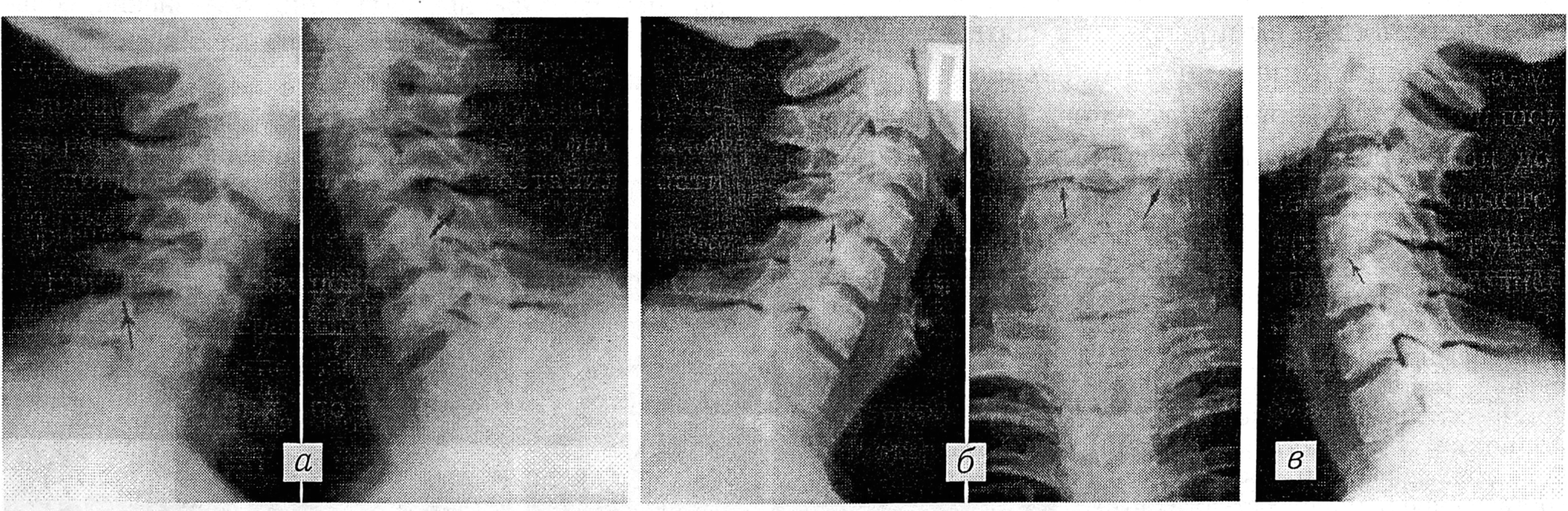 При анализе рентгенограмм (стандартных прямой и профильной, а также в двух косых проекциях по нашей методике) выявлено одностороннее смещение у 5 больных и двустороннее — у 8. Смещение по дугоотростчатым суставам в поврежденном сегменте отмечено в пределах 1/3 их суставных поверхностей, по телам соответствующих позвонков — до 2 мм их сагиттального размера.
