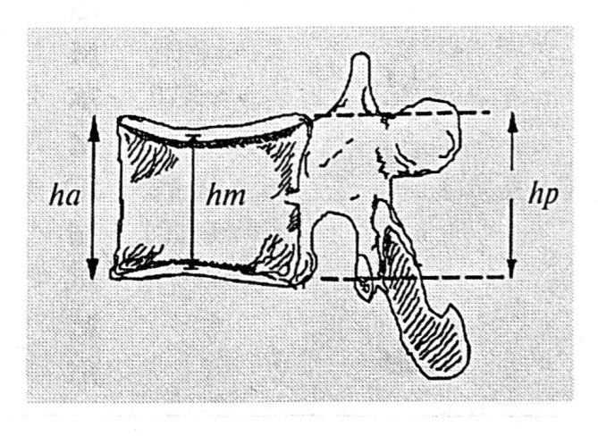 Рис. 1. Высоты тел позвонков: ha — передняя, hm — средняя, hp — задняя.