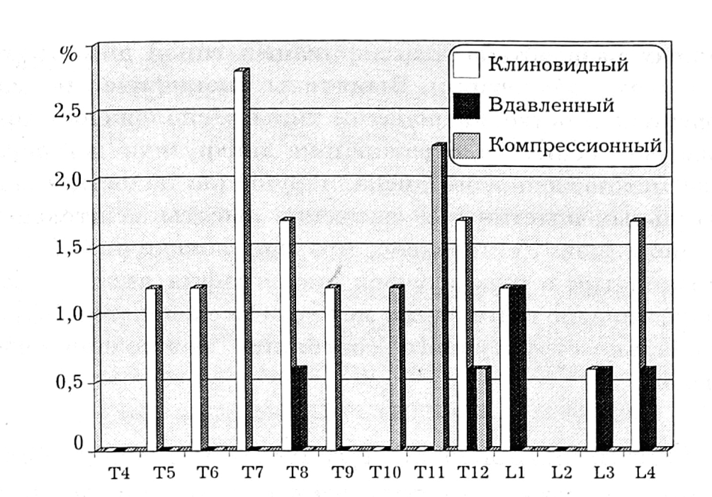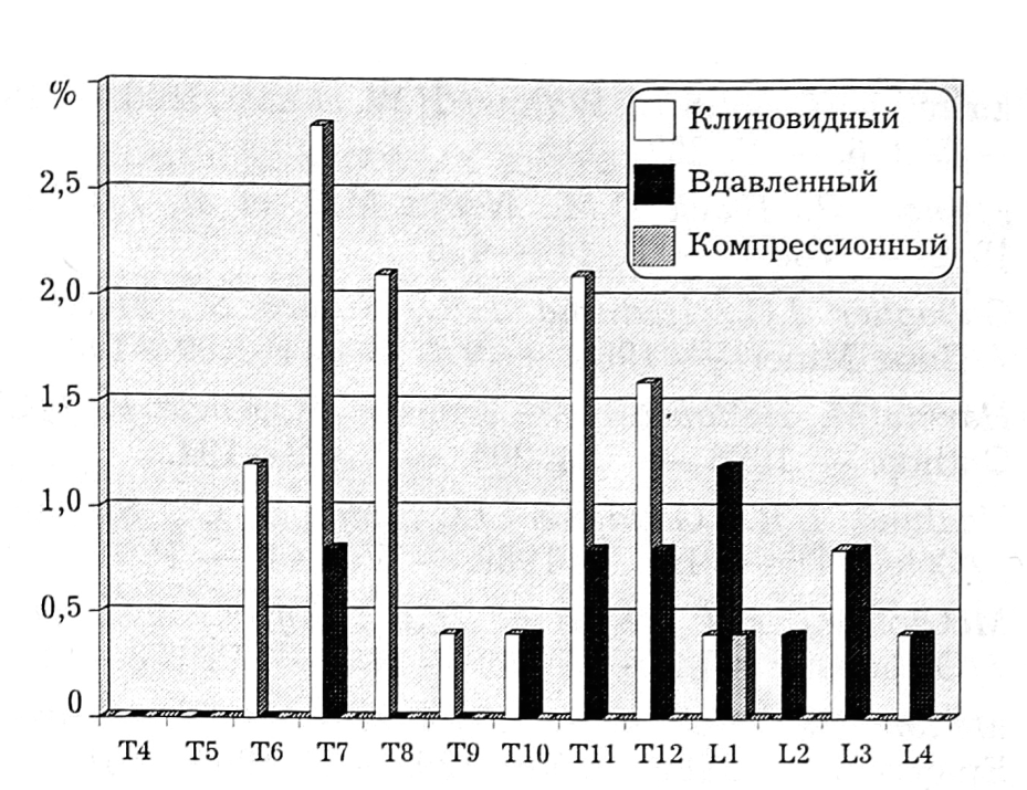 Рис. 2. Частота основных переломов тел позвонков (в %) у мужчин.