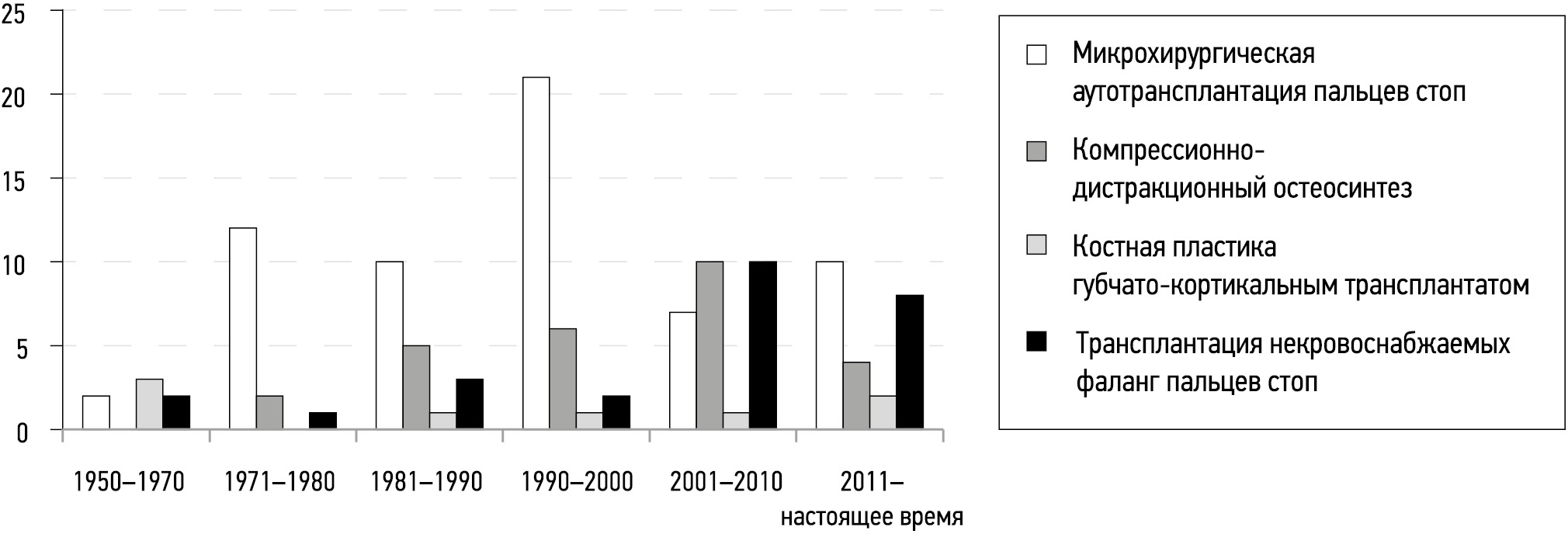 Впервые о выполнении трансплантации некровоснабжаемой фаланги пальца стопы в дефект пальца кисти сообщил немецкий хирург H. Wolff в 1910 году [25]. Он провел 27-летней женщине пересадку проксимальной фаланги второго пальца стопы в позицию средней фаланги второго пальца кисти, удаленной ранее из-за лизиса вследствие перенесенной туберкулезной инфекции.
