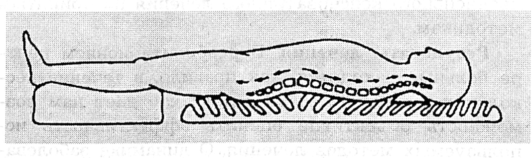 Методика «детензор»-терапии подробно описана авторами метода [6, 8]. При использовании ДМ происходит растяжение мышц спины слабой степени, которое достигается перенаправлением силы тяжести тела и ведет к разгрузке позвоночника. Вес тела лежащего человека действует на опору вертикально. Наклонные опорные ребра мата-детензора (см. рисунок) при нагружении их действуют как поворотные рычаги — возникает усилие в горизонтальном направлении, при этом величина растягивающего усилия зависит от массы тела больного. Ребра мата сгибаются в направлении головы и ног, этот наклон и создает тракционную силу.