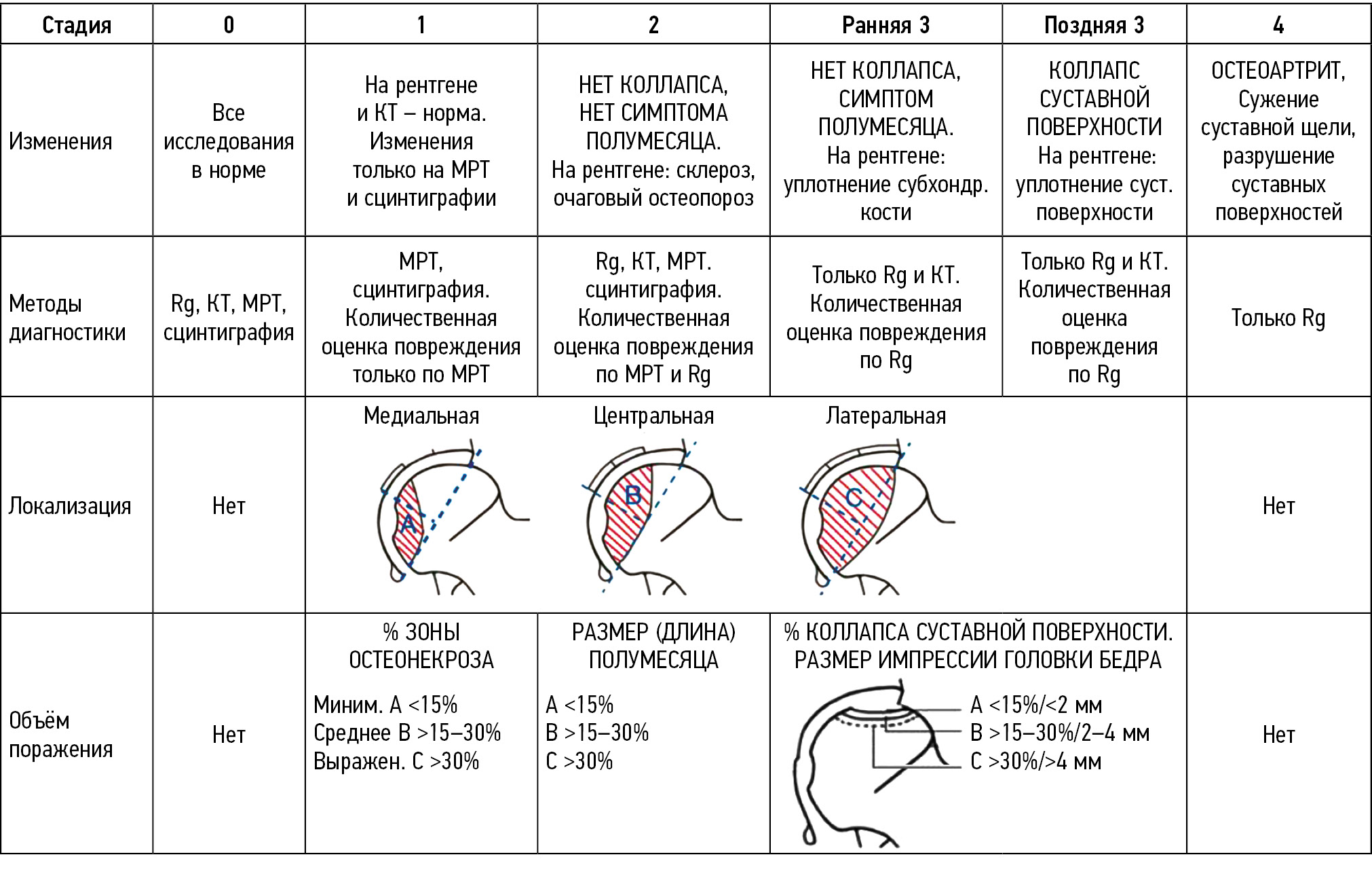 Для оценки рентгенологической картины использовали классификацию некроза головки бедра ARCO (Association Research Circulation Osseous), учитывающую объём поражения головки бедра и степень импрессии (рис.).