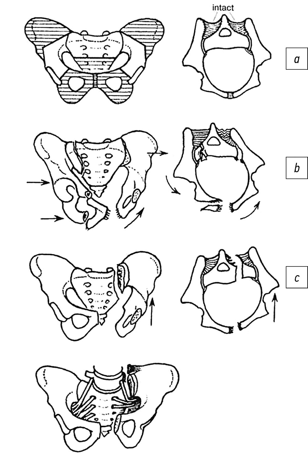 2. Fig. 1. AO/OTA classification of pelvic fractures: type a — stable injuries in which the integrity of the bone-ligamentous apparatus of the posterior pelvic ring is not broken, the pelvic diaphragm is intact; type b — partially stable, accompanied by incomplete rupture of the posterior pelvic ring and pelvic diaphragm, in which rotational instability may occur; type c — unstable damage of the pelvic ring with complete loss of integrity of the posterior pelvic ring and pelvic diaphragm, rotational and vertical instability [6].