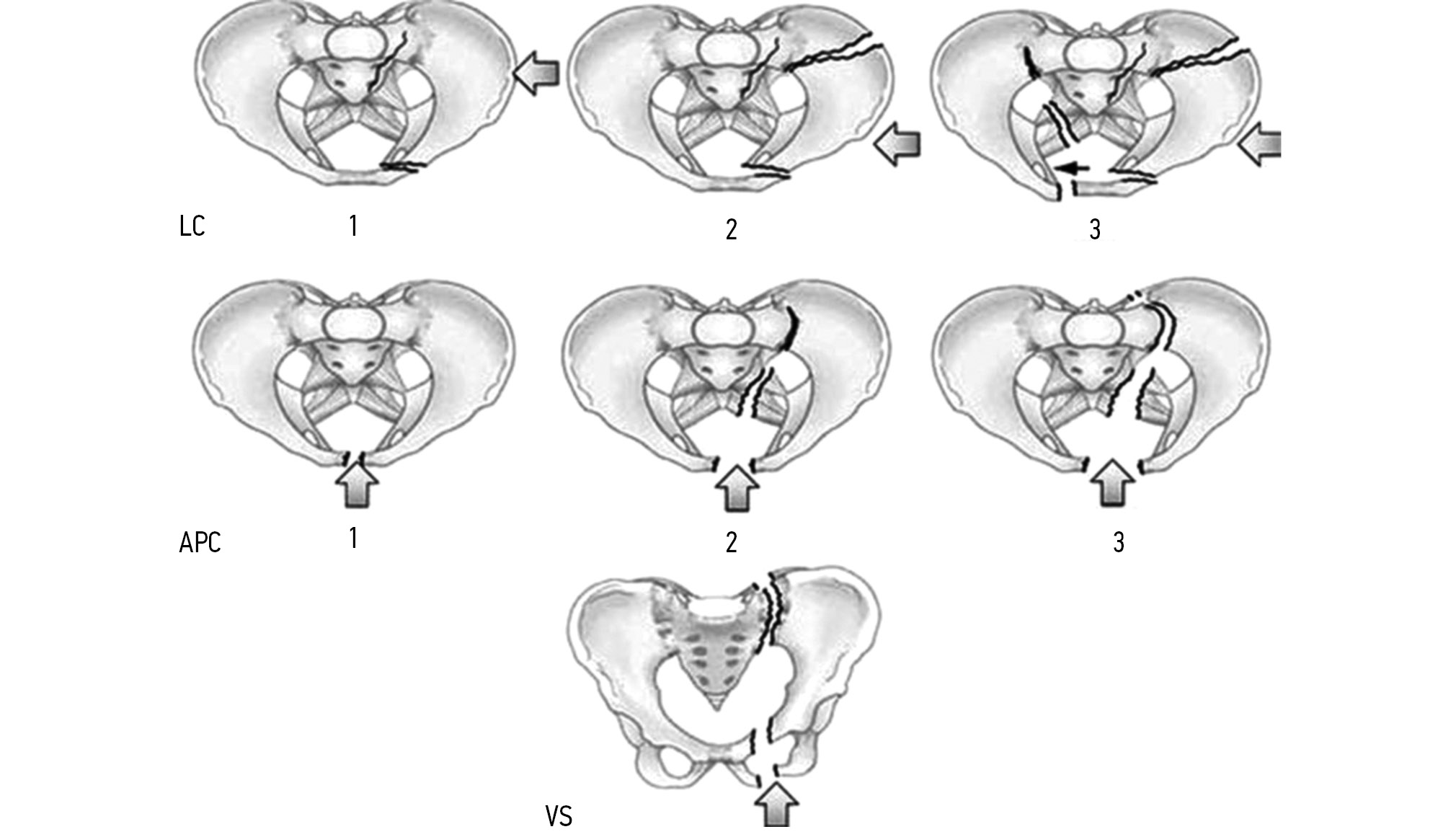 3. Fig. 2. Young–Burgess classification [7]. LC — lateral compression: 1 — compression fractures of the pubic rami (superior pubic ramus and inferior pubic ramus) and ipsilateral anterior sacral ala; 2 — rami fracture and ipsilateral posterior ilium fracture dislocation; 3 — ipsilateral lateral compression and contralateral APC (windswept pelvis). APC — anterior posterior compression: 1 — symphysis widening <2.5 cm; 2 — symphysis widening >2.5 cm, anterior SI joint diastasis, disruption of sacrospinous and sacrotuberous ligaments; 3 — SI dislocation with associated vascular injury. VS — vertical shear: posterior and superior directed force.