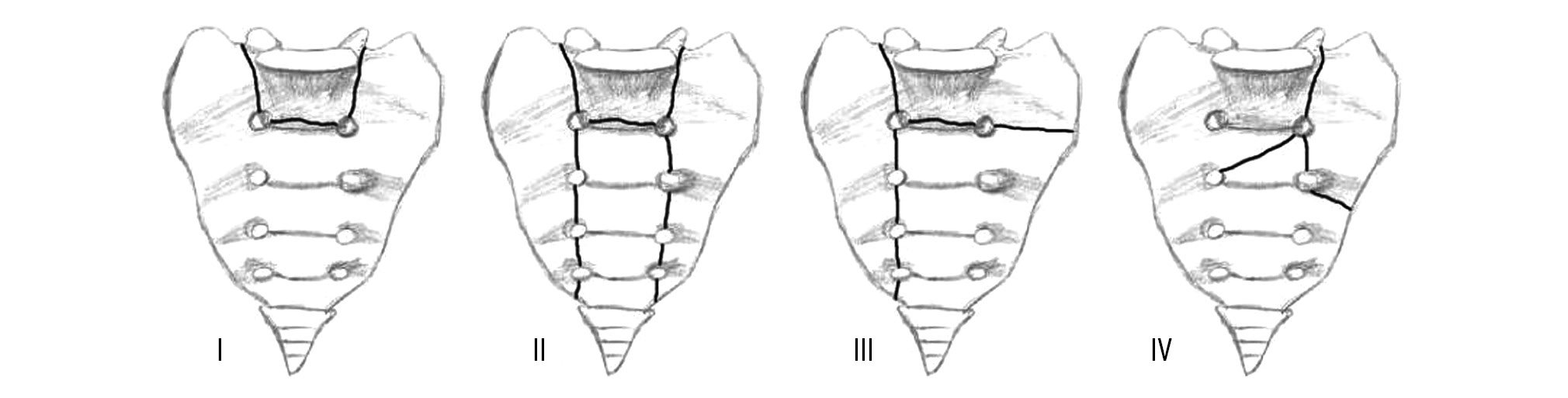 4. Fig. 3. Classification of combined sacral fractures according to the sacral fracture line: I — U-shaped; II — H-shaped; III — T-shaped; IV — λ-shaped [9].