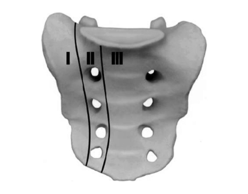 Рис. 4. Классификация по Denis: зона I — линия перелома проходит через крылья крестца латеральнее крестцовых отверстий; зона II — линия перелома проходит на уровне крестцовых отверстий; зона III — линия перелома проходит через канал крестца медиальнее крестцовых отверстий [11].