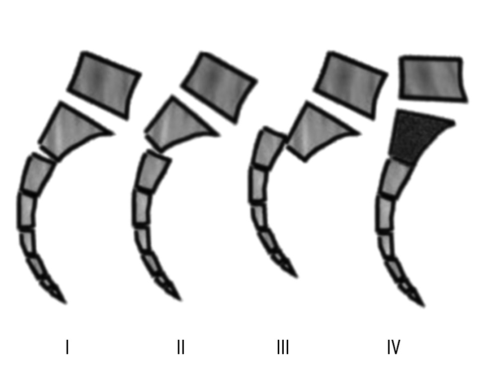 6. Fig. 5. The Roy-Camille classification: type I — fractures show kyphotic angulation only; type II — fractures demonstrate both kyphosis and retrolisthesis; type III — fractures have complete anteriorlisthesis; type IV — fractures characterized by severe comminution of the SI body [13].