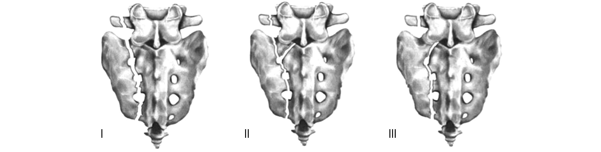 • тип III — крайне нестабильный, медиальный по отношению к суставной фасетке LV–SI, представляющий собой своего рода позвоночно-тазовую диссоциацию [15], возникающую, как правило, при вертикальном сдвиге.