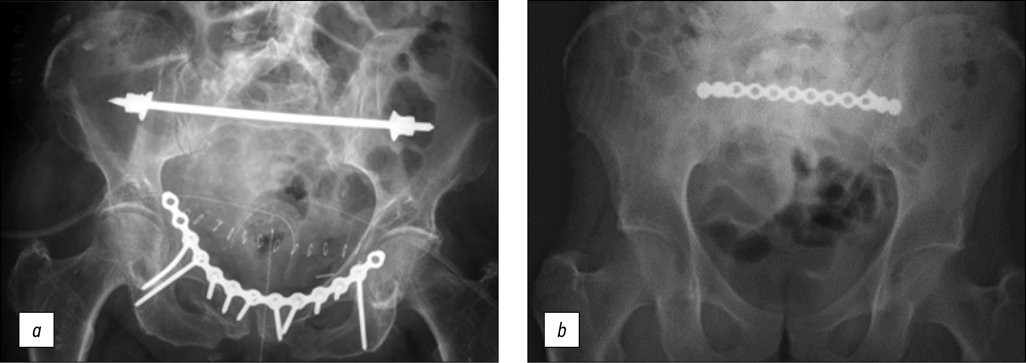 Рис. 7. Системы трансподвздошной мостовидной фиксации [19, 39]. a — обзорная рентгенограмма таза, демонстрирующая трансподвздошную мостовидную фиксацию заднего полукольца таза балкой, b — обзорная рентгенограмма таза, показывающая трансподвздошную мостовидную фиксацию заднего полукольца таза пластиной.