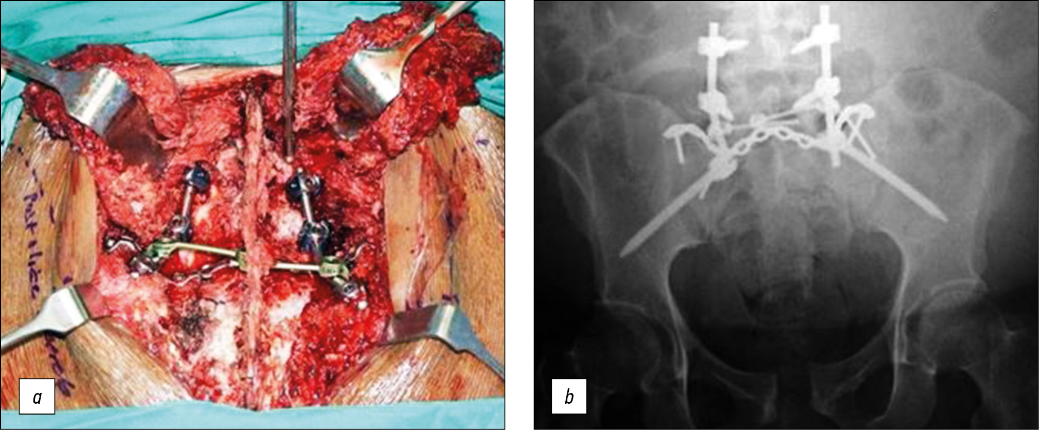 Рис. 8. Триангулярный остеосинтез заднего полукольца таза [42]. a — интраоперационное фото, b — обзорная рентгенограмма таза.