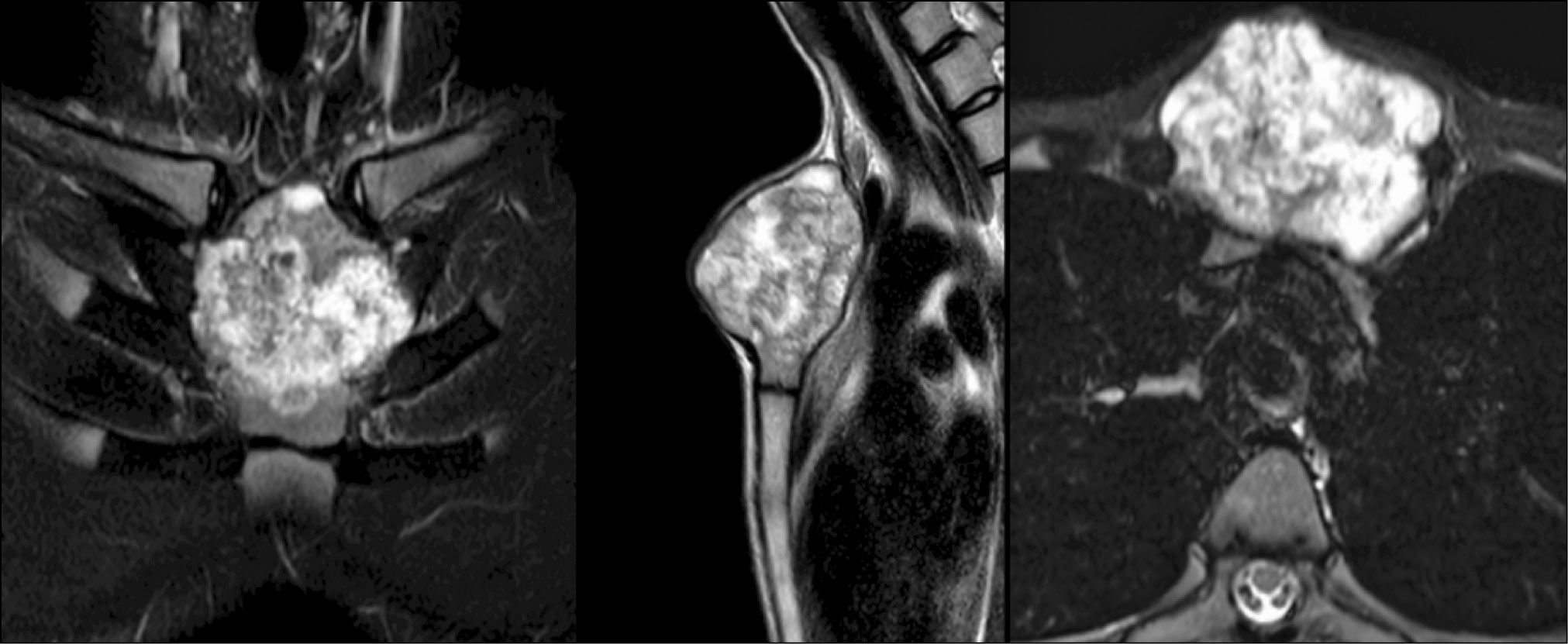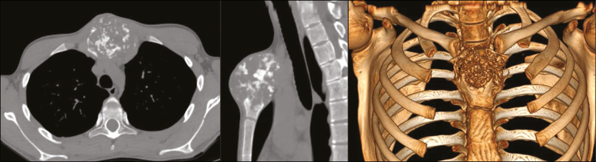 Проведена открытая биопсия патологического очага. По данным гистологического заключения поставлен диагноз: «Хондросаркома G1 рукоятки грудины». При обследовании по итогам компьютерной (КТ) и магнитно-резонансной томографии (МРТ) обнаружено объёмное образование в проекции рукоятки грудины с элементами литической деструкции костных структур (рис. 1, 2).