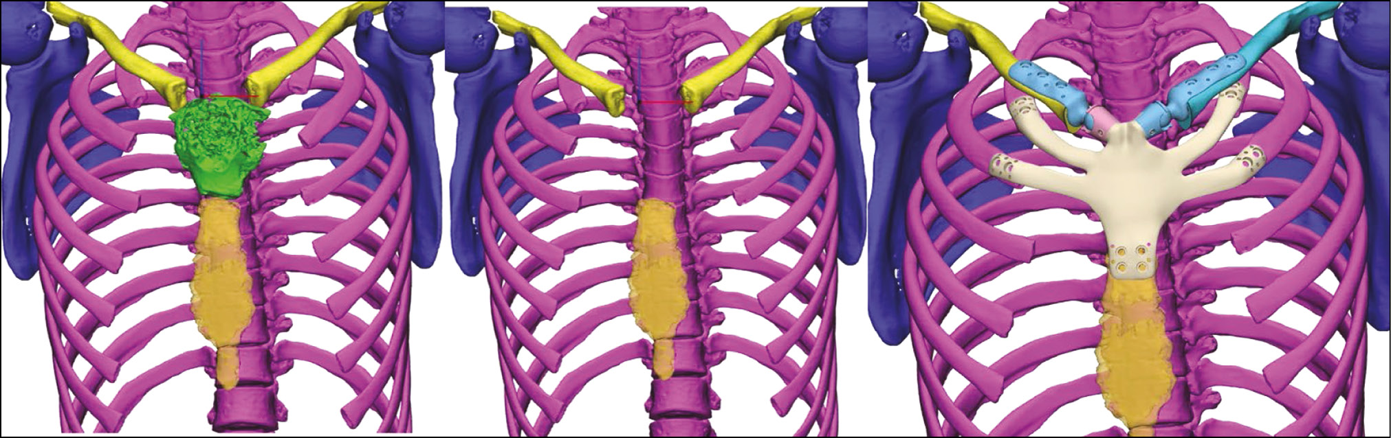 Индивидуальное протезирование при опухолевом поражении анатомических структур грудины является вариантом решения для многих хирургических случаев в связи неоднородными формами грудной клетки пациентов, а также ввиду различных объёмов поражения. При проектировании индивидуальных имплантов следует учитывать множество факторов, в том числе биомеханику дыхания и опороспособность верхнего плечевого пояса, включая грудино-ключичное сочленение. Как и в случае со всеми индивидуальными изделиями, не исключается вероятность погрешности при их изготовлении, поэтому необходимо строго соблюдать укладку пациентов при КТ-исследовании и контролировать объём выбранной резекции костной ткани до установки индивидуального импланта.