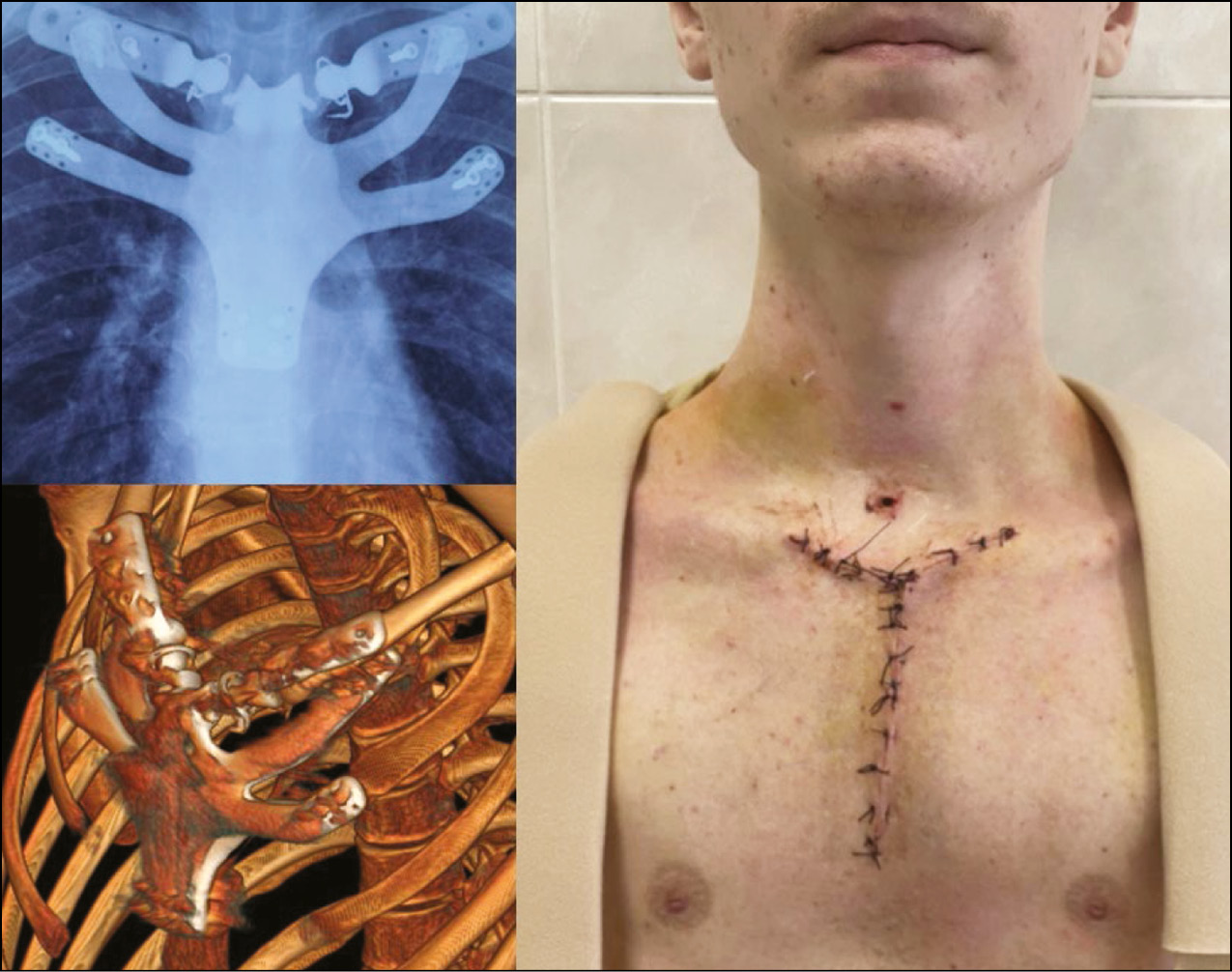 Попытки провести анализ выполненной нами хирургической техники и вида применённого импланта в соотношении с данными литературы оказались затруднительными в связи с тем, что аддитивные протезы с элементами замещения рукоятки грудины описаны всего в нескольких источниках, при этом ни один из описанных имплантов не имел подвижного грудино-ключичного сочленения [11, 14, 15]. По нашему мнению, сохранение опороспособности и биомеханики верхнего плечевого пояса является очень важным аспектом, что и было реализовано в представленном нами случае. Кроме того, гибридный тип креплений к костным элементам позволяет добиться прочного контакта с имплантом и избежать нестабильности протеза, что наиболее важно для созревания рубцовой ткани в раннем послеоперационном периоде.