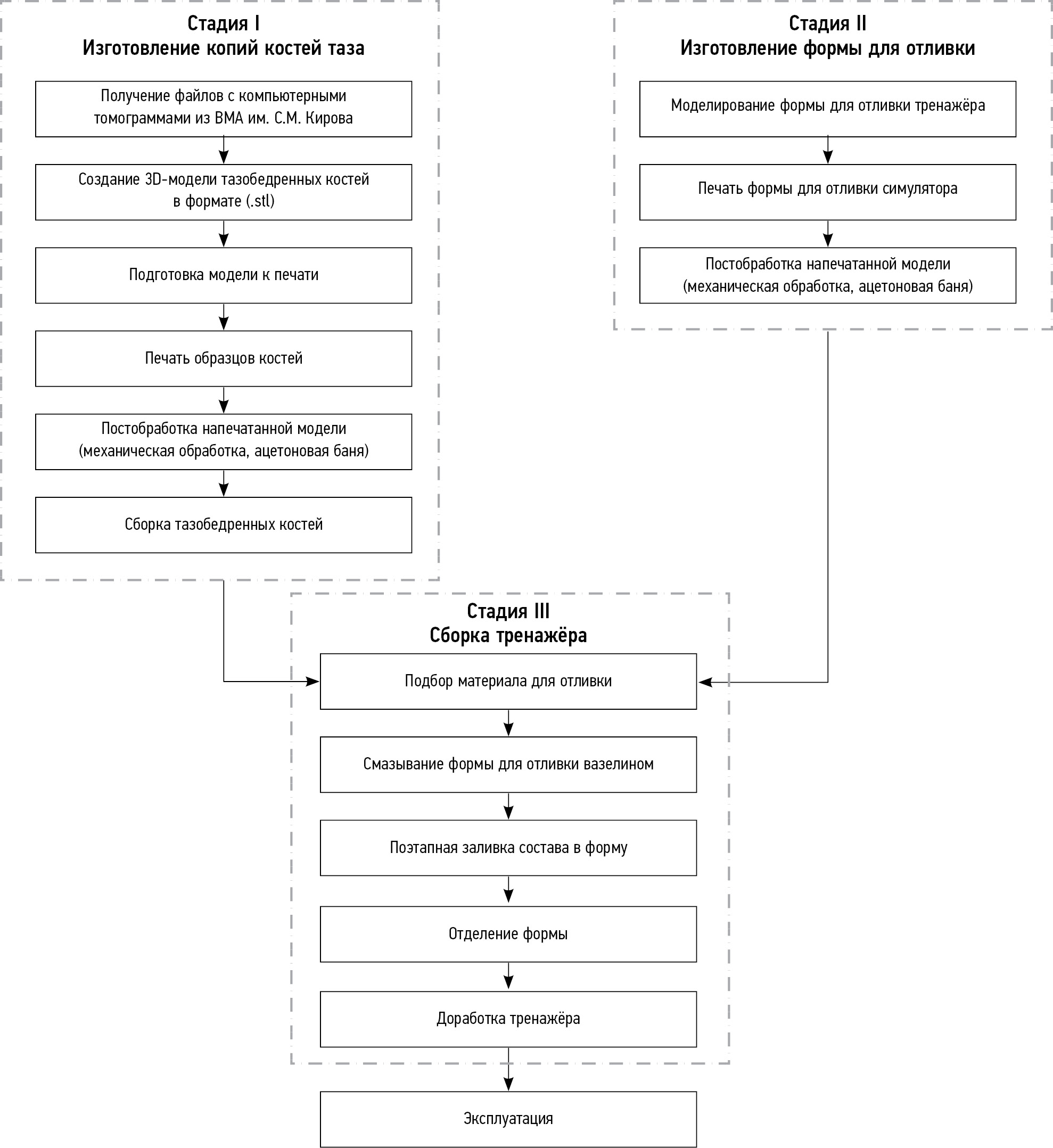Процесс изготовления симулятора для наложения устройства внешней фиксации КСТ при нестабильных переломах таза (в дальнейшем — симулятор) разбит на 3 основных этапа: