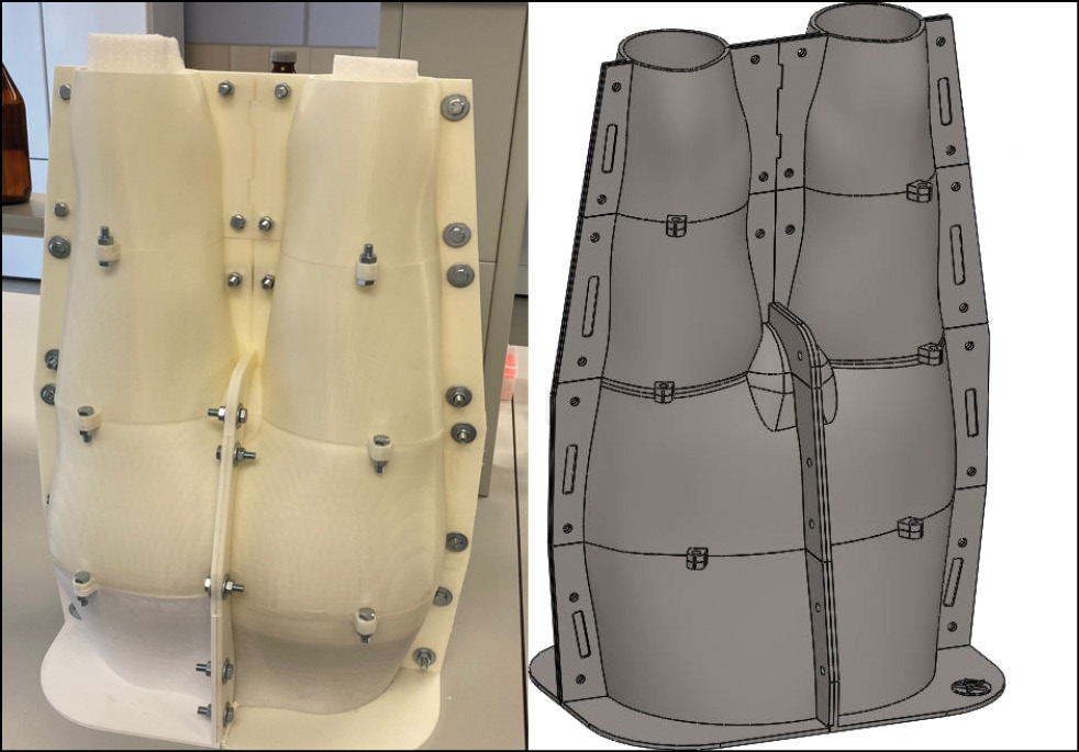 На этой стадии осуществляли моделирование и печать отливочной формы по технологии, аналогичной таковой при создании моделей костей. Ввиду ограниченности печатного пространства принтера (300×300×600 мм), а также для упрощения разборки и извлечения готового симулятора из формы модель разделили на 16 сегментов (рис. 5). Масса готовой формы составила 4 кг без учёта крепёжных узлов (болты, шайбы, гайки).