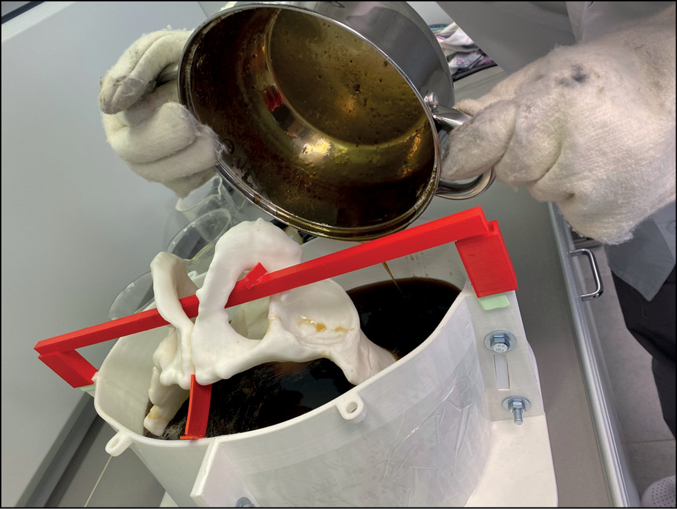 На следующем этапе осуществляли заливку путём посегментного добавления расплавленного желатин-глицеринового состава в форму с размещёнными внутри образцами костей и производили постобработку полученного изделия. На внутреннюю поверхность формы наносили вазелин для облегчения последующего отделения фантома, места стыковки заполняли силиконом для предотвращения вытекания смеси. Глицерин объёмом 1 л нагревали в металлической кастрюле ёмкостью 1,5 л до 120–125 °С, затем в ту же ёмкость засыпали технический желатин массой 250 г. Температуру смеси поддерживали на уровне 120 °С на протяжении 5 мин. Для заливки в форму смесь предварительно охлаждали до температуры 90–95 °С во избежание плавления ABS-пластика (рис. 8). Заливку осуществляли в 3 этапа с интервалом в 24 ч.