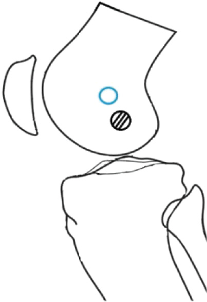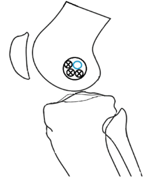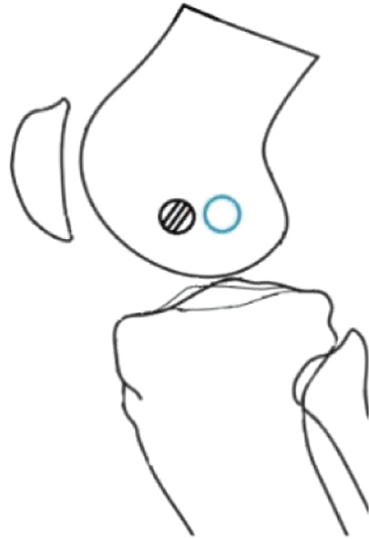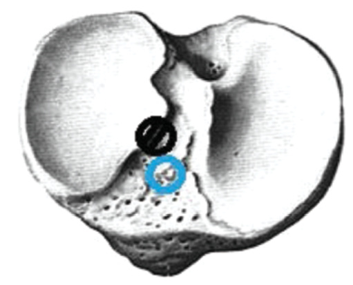 When forming the femoral channel, we focused on the posterior wall of the intercondylar fossa. In most cases, no problems were encountered during site selection for the formation of a new femoral channel. When the primary femoral channel was located anteriorly, a new channel was formed 2–3 mm posteriorly and no more than 7 mm in diameter (Fig. 6).