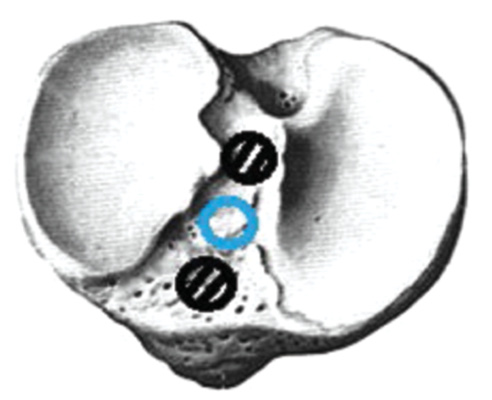 If the primary channel was located anteriorly or posteriorly (Fig. 3), a standard channel in the tibial bone was performed. When making a channel of a larger diameter, the graft was centered in the channel using Milagro screws (DePuy Mitek, USA).