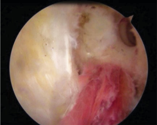The intercondylar fossa was usually filled with scar tissue, which also included remnants of an ACL autograft or allograft. Autograft removal was quite easy and efficient, whereas allograft (dacron) removal was more time-consuming because of the rough structure of the material.