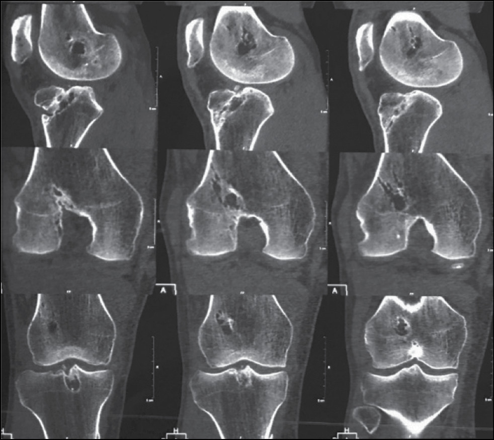 The preoperative examination included X-ray images of the knee joint in two views, namely, anteroposterior and lateral in full lower leg extension in the knee joint. Before the surgery, CT of the knee joint was obligatory. CT images were used to determine the topical location of the femoral and tibial channels, their enlargement, narrowing of the joint cavity, and location and type of the fixing structure (Fig. 13).