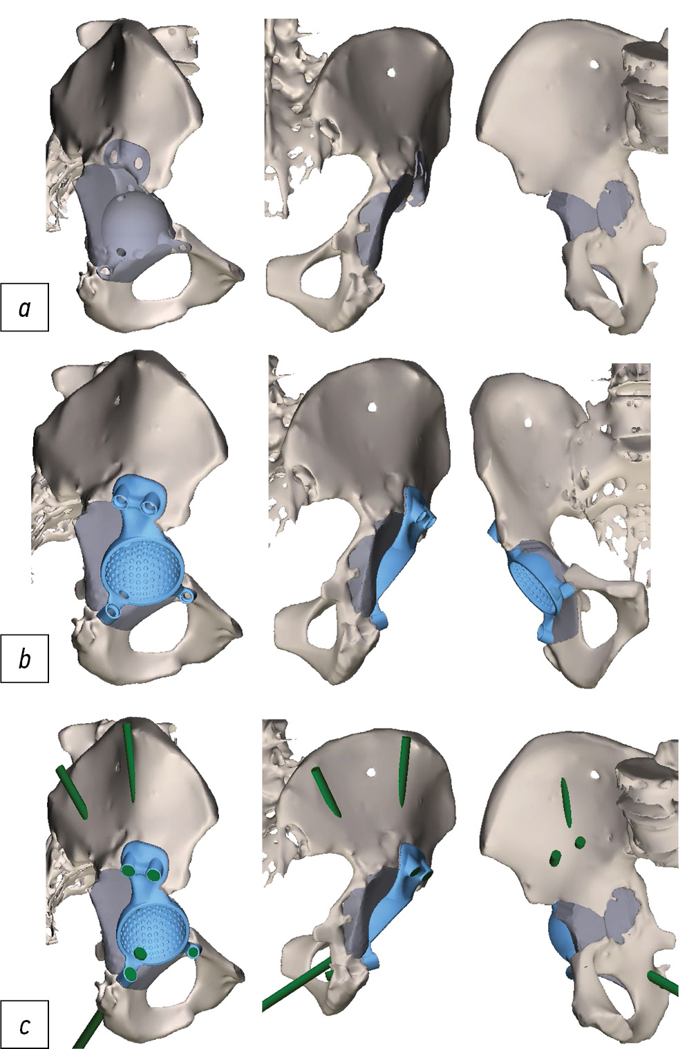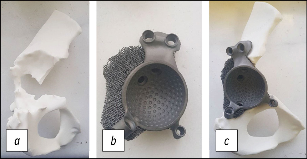 Рис. 4. Этап предоперационной подготовки: а — окончательная пластиковая модель таза; b — готовый имплантат; c — сопоставление готового имплантата с пластиковой моделью таза.