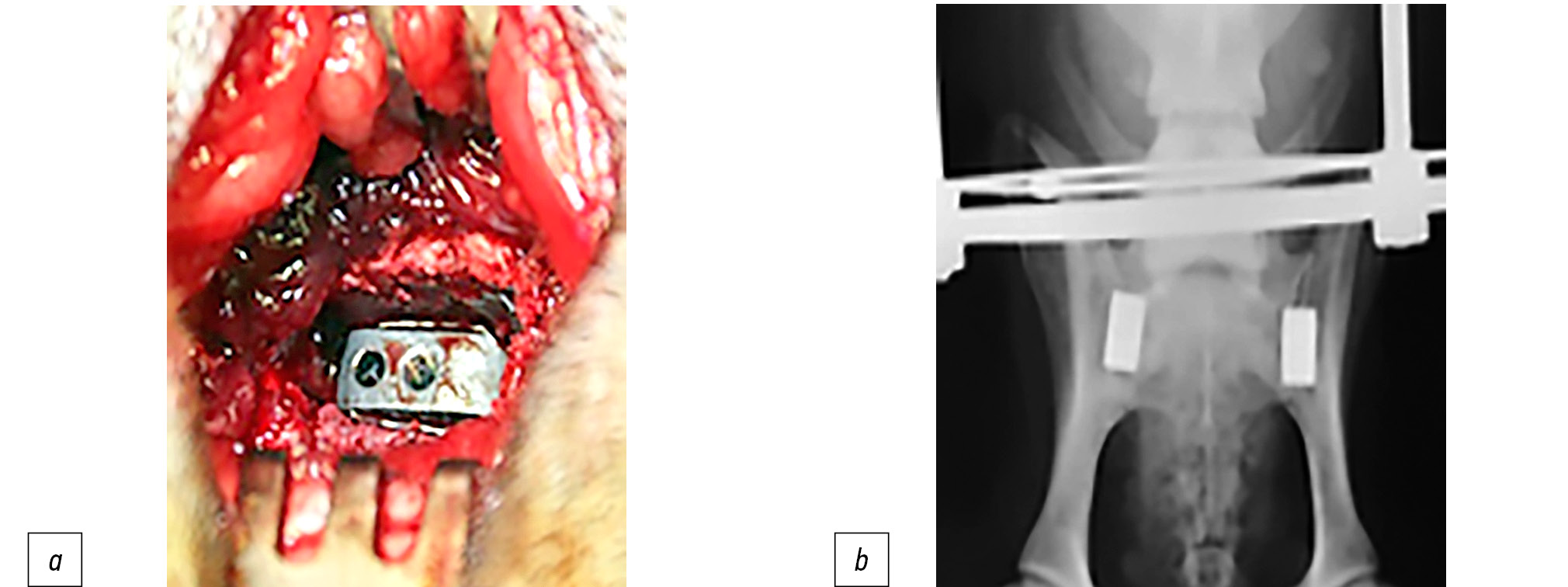 The main goal of the experiment was to examine the safety and primary efficiency of 3D titanium cages for interbody fusion and iliosacral blocking. The experimental group consisted of 14 animals, and the control group included three animals. Premedications included 1% dimedrol (0.02 mg/kg), 0.1% atropine sulfate (0.02 mg/kg), 1% droperidol (0.5 mg/kg), and 2% rometar (1 mg/kg). For intravenous anesthesia, 5% sodium thiopental solution at a dose of 10 mg/kg was administered. The animals were removed from the experiment after 6 (n=5), 12 (n=6), and 18 (n=3) months. Euthanasia was performed after premedication, followed by the administration of a lethal dose of barbiturates.