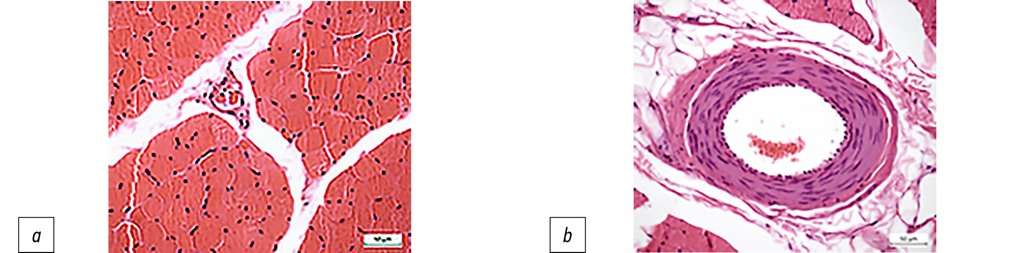 In the control group, the histostructures of small lumbar and sacrococaudal (coccygeal) dorsal lateral muscles were characterized by polygonal uniform profiles of muscle fibers, minimal connective tissue interlayers (Fig. 2a), and perimyseal arterial vessels with open lumen and circular orientation of smooth muscle cells (SMCs), without membrane fibrosis (Fig. 2b). Few myosymplasts with signs of reversible contractures, intramuscular nerve trunks, and neuromuscular spindles of normal structure were observed.