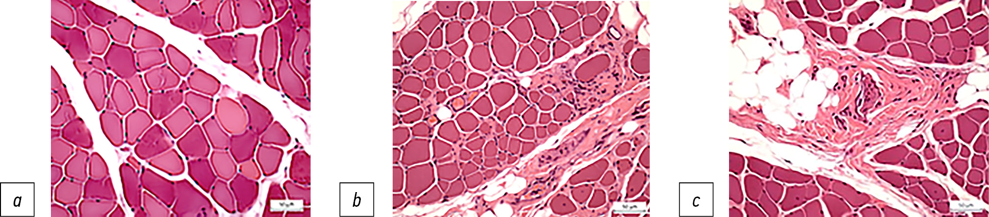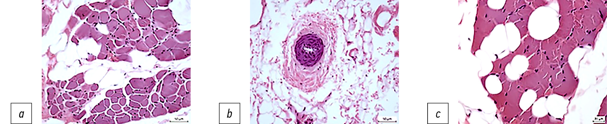 Fig. 3. Histostructure of the psoas minor (a, b) and the sacro-caudal (coccygeal) dorsal lateral muscle (c) after 6 months of the experiment: a, c — variability in the size of myosymplasts, endomysial fibrosis, adipocytes in bundles of muscle fibers; b — arterial vessel with severe fibrosis of the adventitial and middle membranes, impaired circular orientation of the smooth muscle cells, obliteration of the lumen. Fragments of paraffin sections; hematoxylin-eosin stain; magnification ×400.