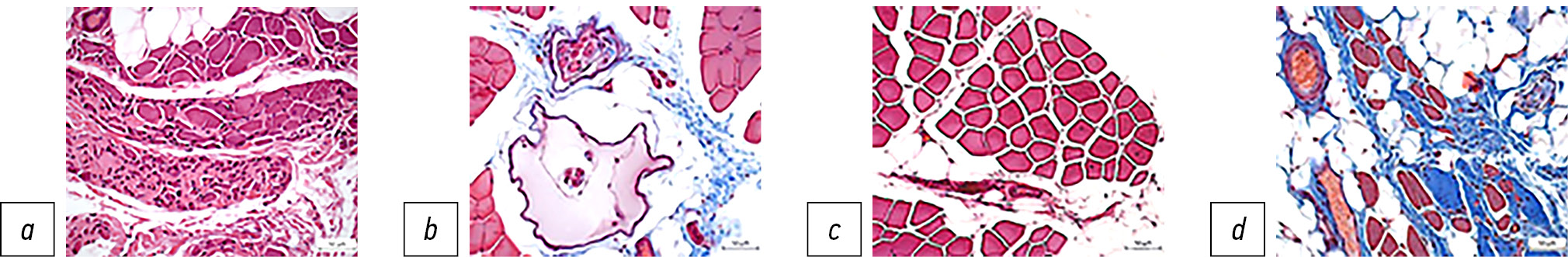 Fig. 5. Histostructure of the psoas minor (a, b) and m. sacrocaudalis dorsalis lateralis (c, d) after 18 months of the experiment: a — myocytes of various profiles and diameters, a group of adipocytes in the muscle bundle (top), a fragment of fibrosis with residual angular muscle fibers (bottom); b — neuromuscular spindles of normal structure and with an enlarged connective tissue capsular; c — polygonal fiber profiles, endomysial fibrosis; d — adipocytes that replaced part of the muscle fibers in the bundle, ischemic fibers are colored blue, fields of adipocytes. Fragments of paraffin sections, stained with hematoxylin-eosin, according to Masson (d); magnification ×400.