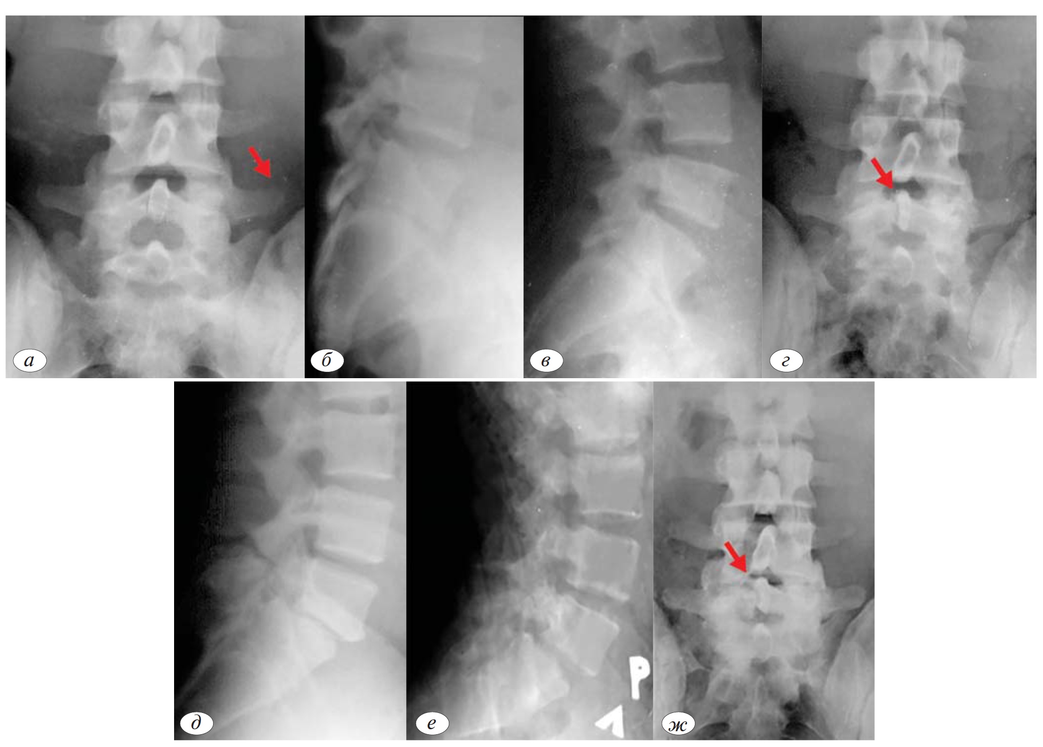 Рис. 2. Больной Н., ЗМС, спортивная гимнастика, сборная России.Рентгенограммы при первичном обращении в возрасте 16 лет — острый спондилолиз L5 позвонка (а), незначительная нестабильность L5-S1 при ФРИ (б, в); г — формирование ложного сустава в области дужки L5 позвонка через 4 года после первичного обращения; д, е — ФРИ — нестабильность L5-S1, антелистез L5; з, и — рентгенограммы через 10 лет после первичного обращения в возрасте 26 лет — ложный сустав дужки L5 позвонка (ж, стабилизация сегмента L5-S1.